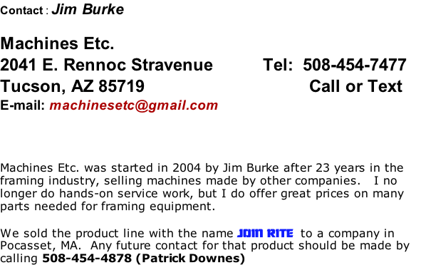 Jim Burke, Machines Etc., Sales,Service, Consulting to the Picture Framing Industry.   Air operated joining machines, double mitre saws, Frame Square sliding top saws.  Fillet Cutters, air compressors, V-Nails, Picture Framing